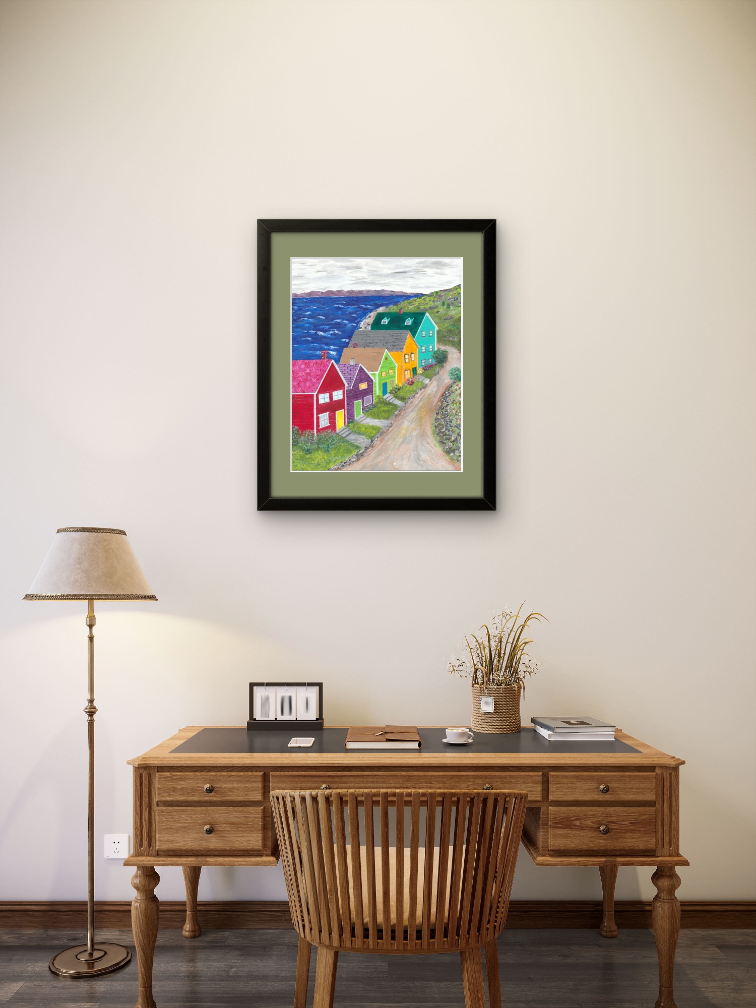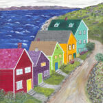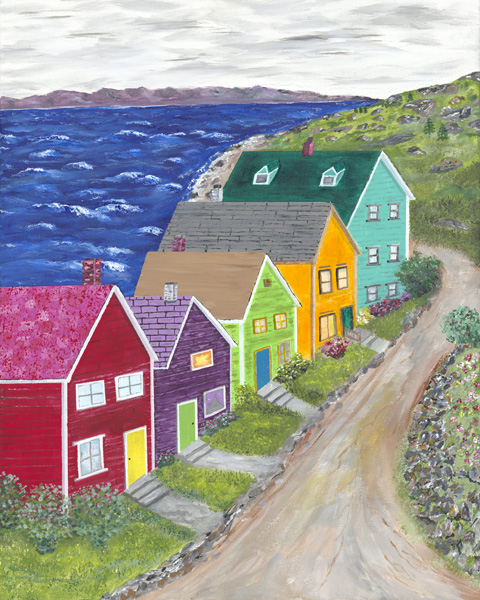 The wind is whipping up the waves on the sea while the whimsically colored houses stand all in a row. Could it be that the splashy colors are more visible through the fog for the returning sailors?